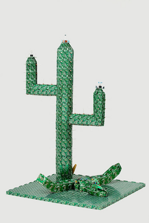 Steven Rodrig (Cuba-born, New Jersey-based) pioneered circuit board sculpture through his "PCB Creations," transforming green boards with colorful components into animals, landscapes, and even a life-size "Royal Data Throne" toilet. His pieces—ranging from hummingbirds to sea turtles with titles like "Sea Turtle Searches for Deep Data"—showcase transistors, resistors, and capacitors as organic forms. Featured in Manhattan Arts International's permanent collection, Rodrig's work proves e-waste is "just lack of imagination."